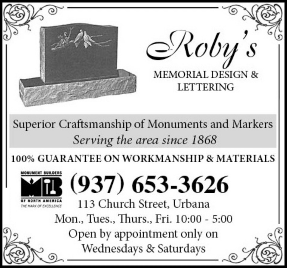 Ads for Roby's Memorial Design & Lettering in Urbana, OH